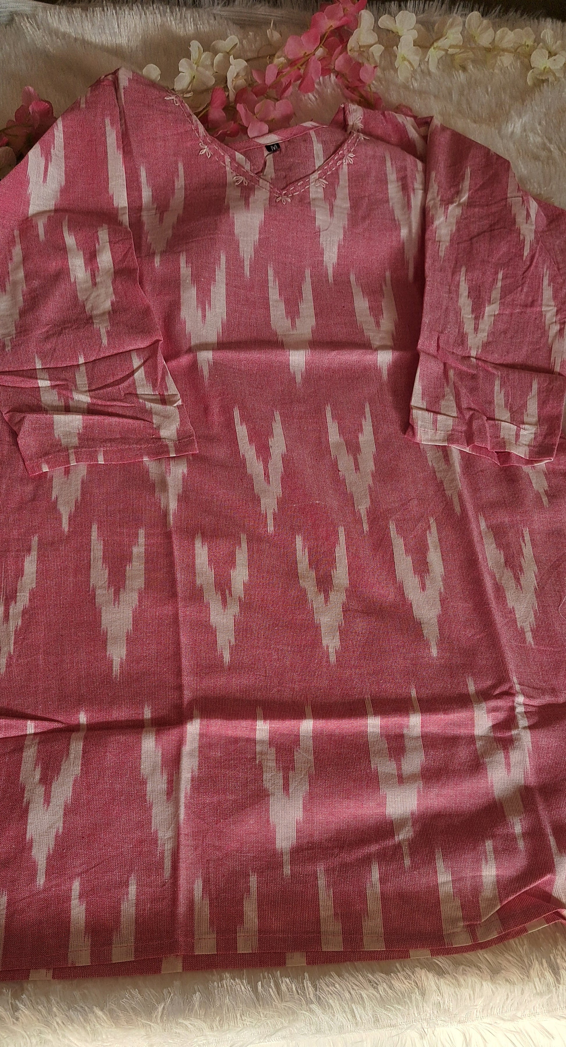 Step into a world of elegance with our pink Ikkat print short top. This stunning top features a beautiful combination of pink hues, adorned with intricate Ikkat patterns. Crafted from high-quality cotton fabric, it offers both comfort and style in a single garment.